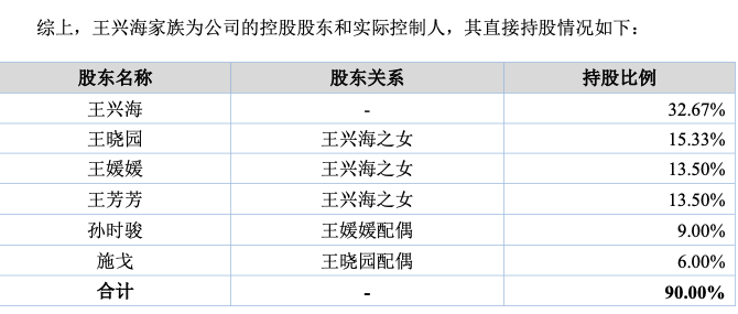 据首轮问询函,根据申请文件,王兴海家族直接持有公司90%的股份;王晓园担任执行事务合伙人并控制的员工持股平台嘉兴土拨、嘉兴永思合计持有公司5%的股份。因此,王兴海家族累计控制公司95%的股份。