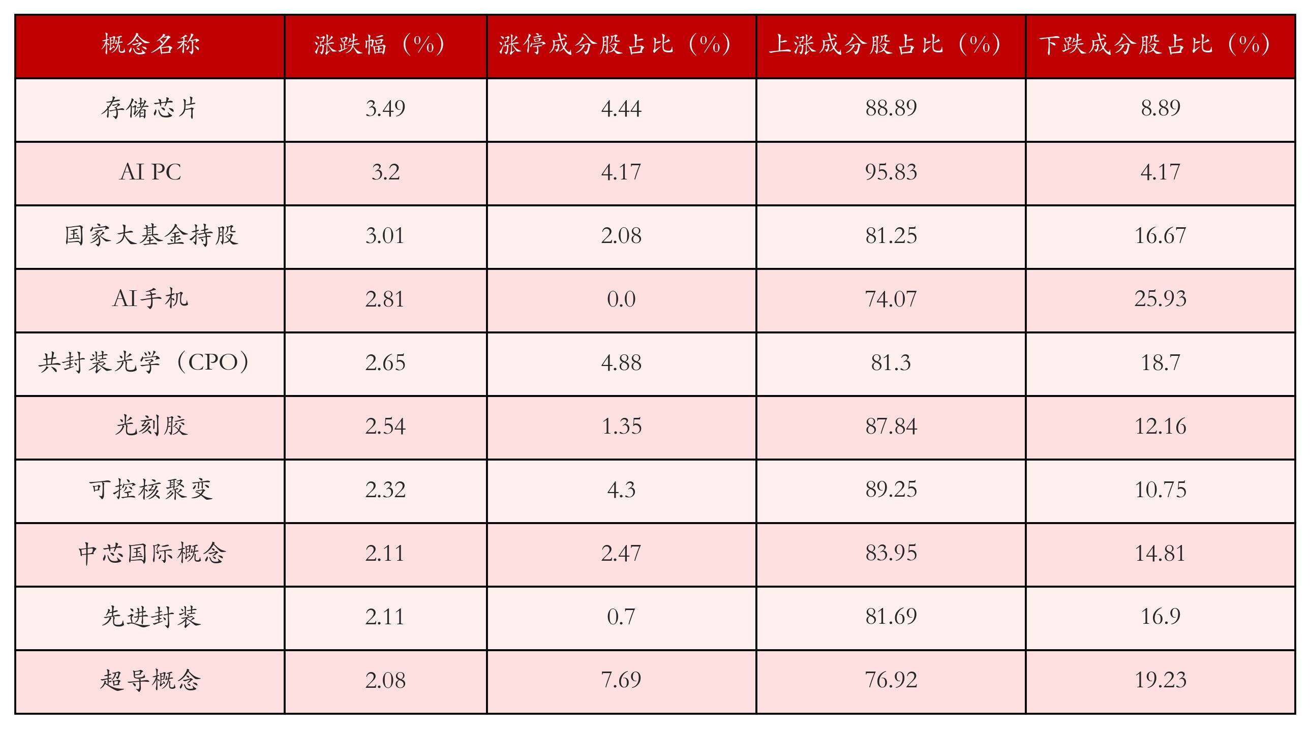 根据A股概念涨跌幅与所对应的股票池综合分析,涨幅靠前的三个概念板块分别为:存储芯片、AI PC与国家大基金持股。排名前10位的概念板块相关数据见下表: