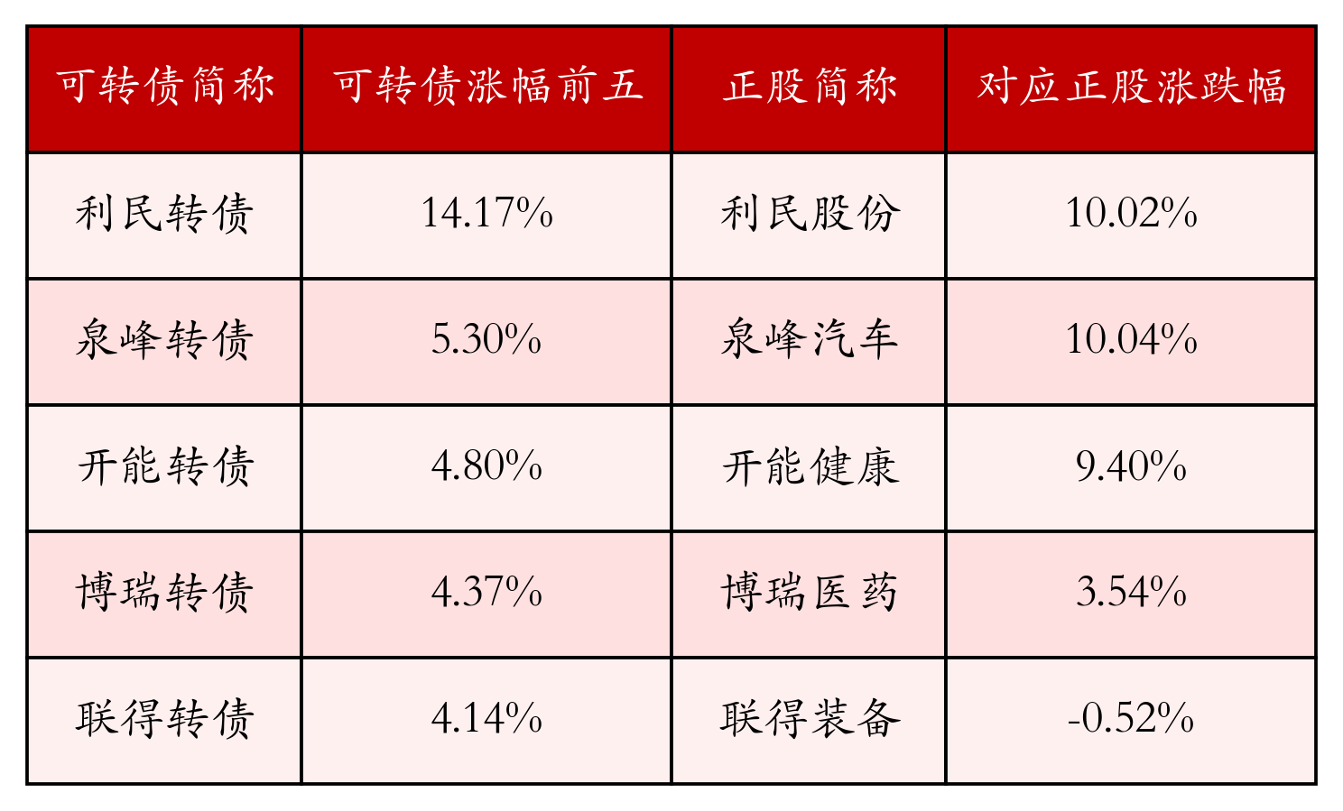 南财智讯6月11日电,南财金融终端盘后数据显示,债市方面,中证转债指数收涨0.31%,报435.8,成交额为712.24亿元。可转债方面,今日共成交470只可转债,其中345只收涨,0只收平,125只收跌。具体来看,23只可转债涨幅超过2%。其中利民转债(128144)涨14.17%,泉峰转债(113629)涨5.3%,开能转债(123206)涨4.8%。今日有6只可转债跌幅超2%,东时转债(113575)跌14.99%,塞力转债(113601)跌10.12%,豪美转债(127053)跌3.09%。存在交易量的可转债所对应的正股中,306只收涨,14只收平,150只收跌。具体来看,10只可转债对应正股涨幅超过5%,其中,泉峰汽车(603982)涨停,收涨10.04%;利民股份(002734)涨停,收涨10.02%。同时所对应的可转债:泉峰转债(113629)同涨5.3%;利民转债(128144)同涨14.17%。今日有2只可转债对应正股跌幅超过5%,没有正股跌停。