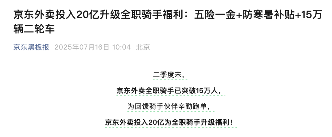 同日,据京东黑板报消息,二季度末,京东外卖全职骑手已突破15万人,京东外卖将投入20亿元为全职骑手升级福利。